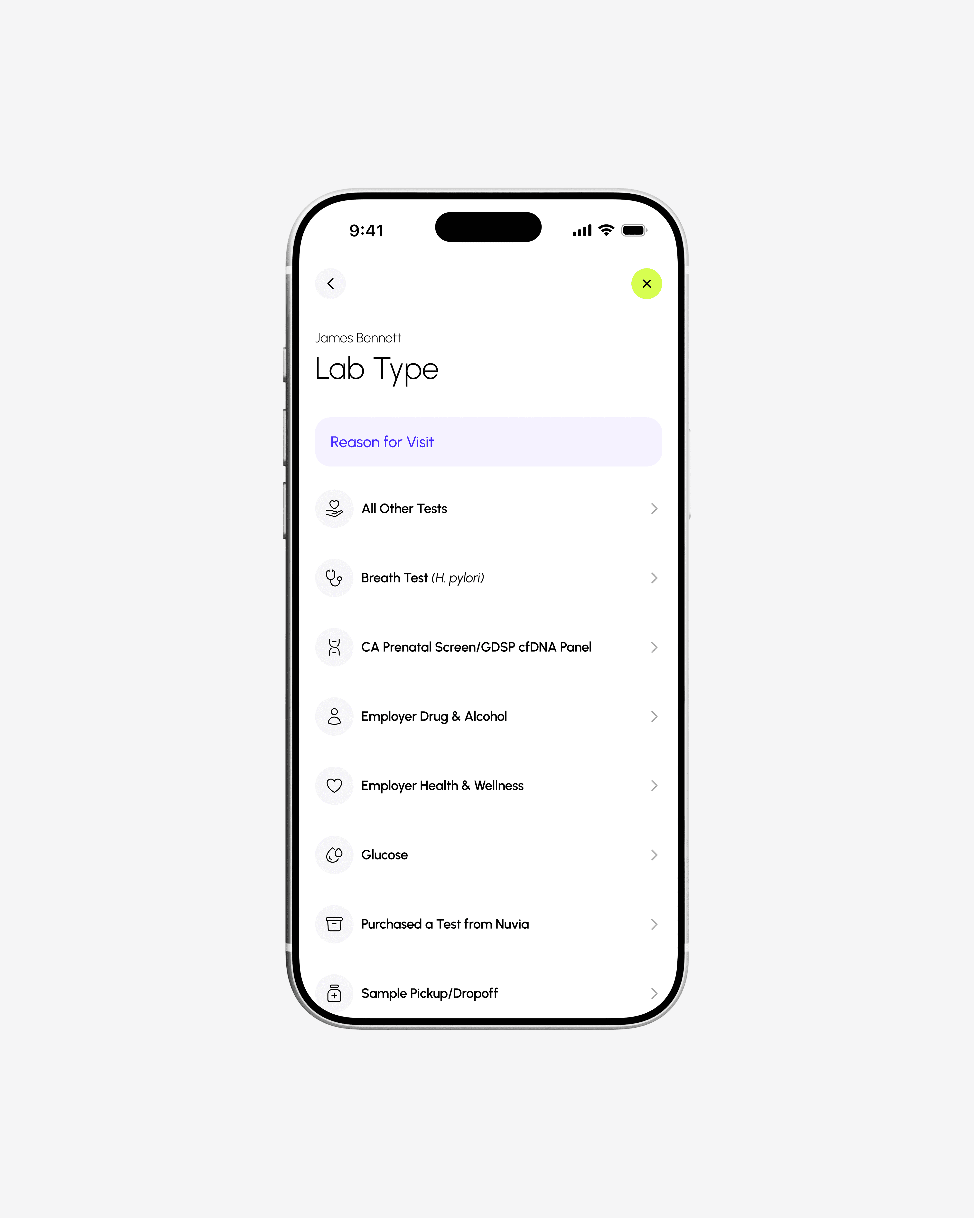 The appointment scheduling flow was designed to be simple, flexible, and easy to navigate. Users can begin by selecting from previously saved profiles or entering their information manually, allowing for quick access while still supporting new or one-time users. After, users are asked to choose the reason for their visit from a selection of lab tests.