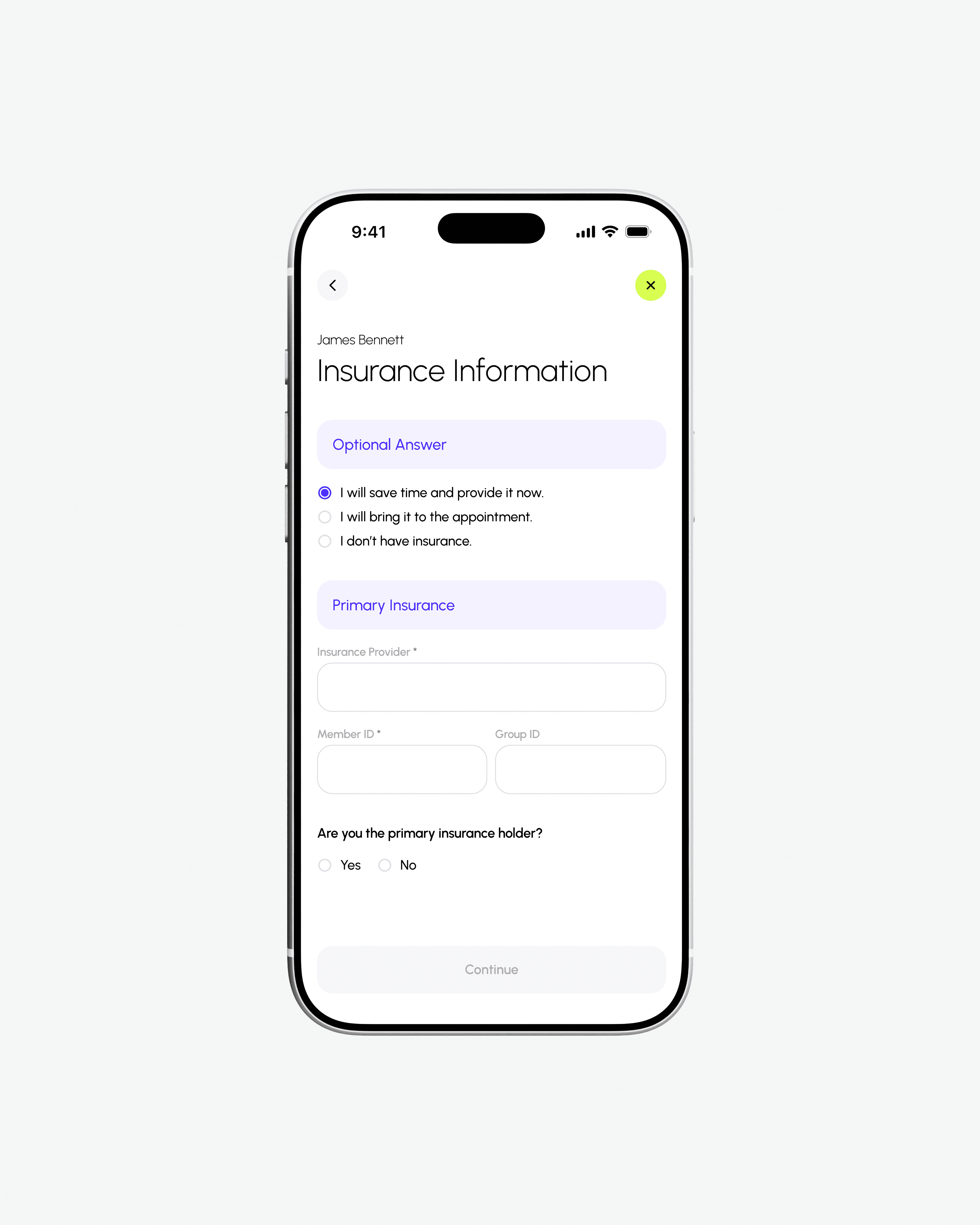 After selecting a time and location, users are prompted to enter their insurance information. The process concludes with a confirmation screen that summarizes all selected details, including date, time, location, and personal information, ensuring accuracy before finalizing the appointment.