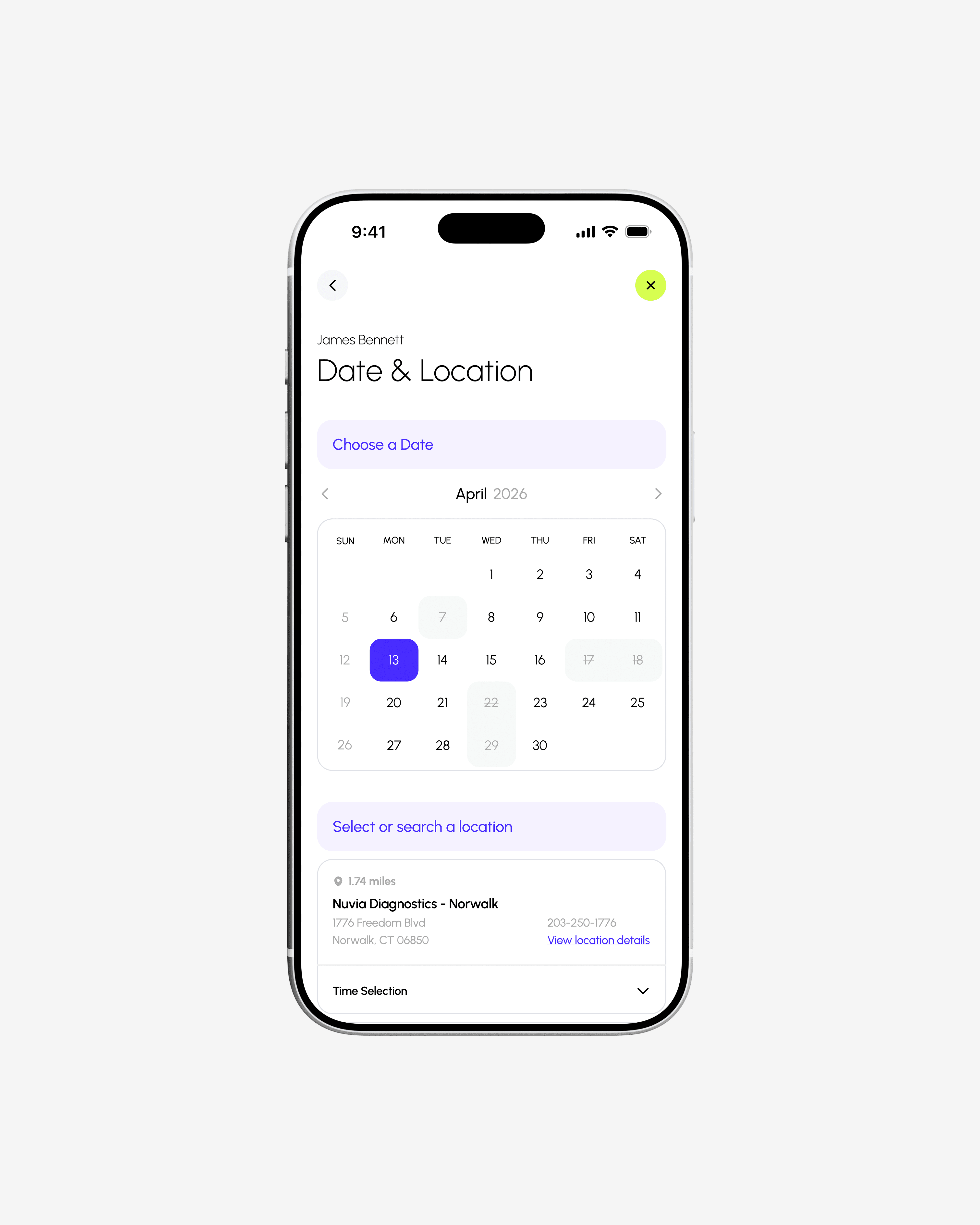 From there, users choose their preferred date, with available options clearly presented and unavailable dates and times visually muted and struck through to reduce confusion. Once a date is selected, nearby lab locations are displayed along with corresponding time slots, helping users quickly find a convenient option based on both location and availability.